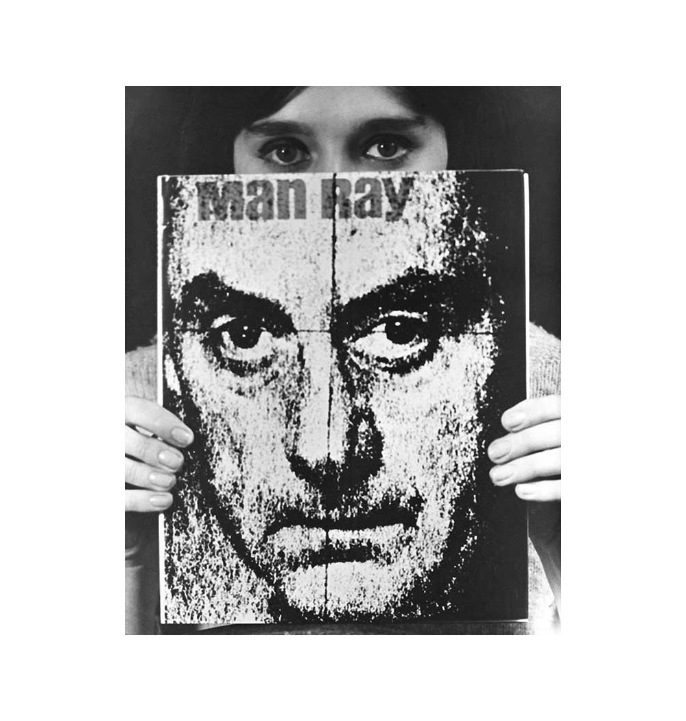 woman holding poster cover of Man Ray's book selfportrait lithography squared close-up on face