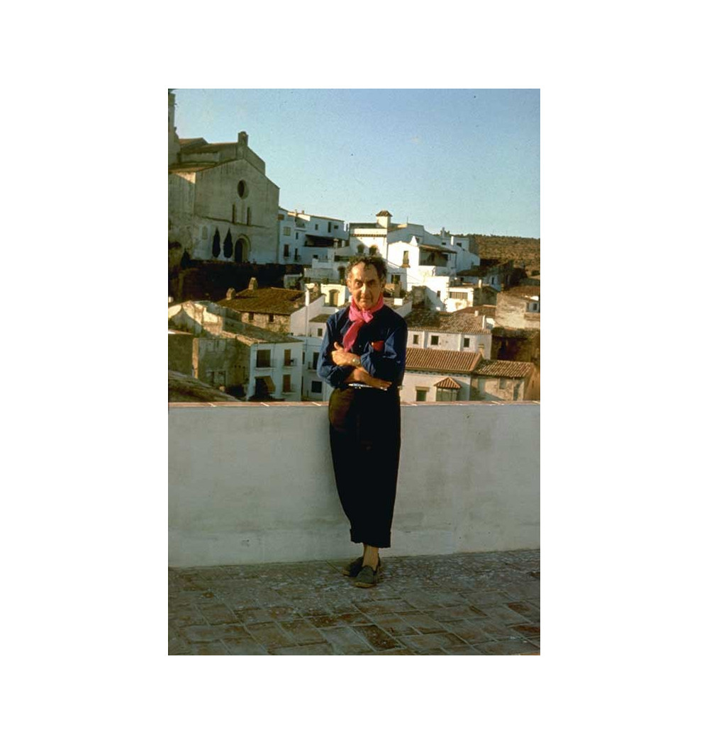 full-length portrait man standing in Cadaqués mountains houses in background colour photograph