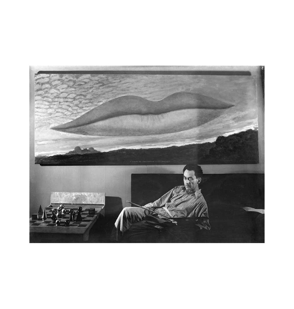 Selfportrait - Man Ray sitting on a sofa under his painting "A l'heure de l'observatoire les Amoureux"