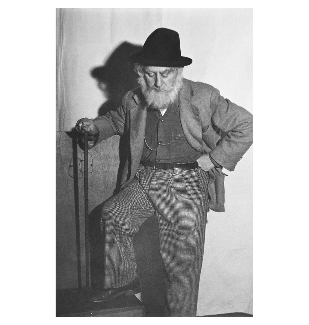 disguised as Walt Whitman elderly person white beard hat foot and arm on wooden piece fo furniture