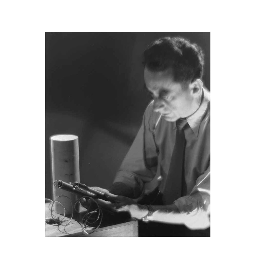 Self-portrait in his workshop, cigarette in mouth, working on an object