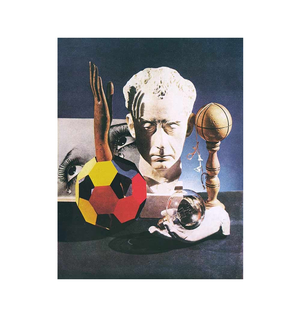 masque en plâtre de Man Ray entouré d'objets dont non-euclidien et photographie Les Larmes (cadrage 2 yeux) - couleur