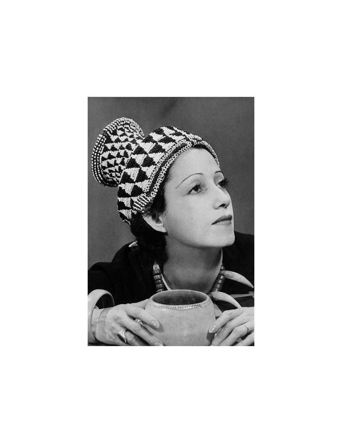 Fashion Ady fashion in Congo Photographie HD (300 DPI Tiff) 1937 - ref : 166/07 €120.00 Adrienne Fidelin, portrait close-up african hat hand behind neck extract from Harper's Bazaar Add to basket