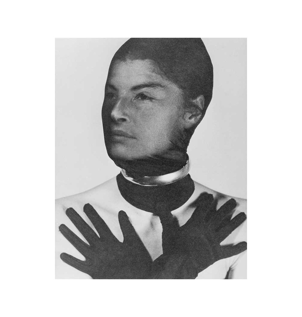 woman arms folded gloves on hands head and face covered with stockings close-up iron necklace around the neck