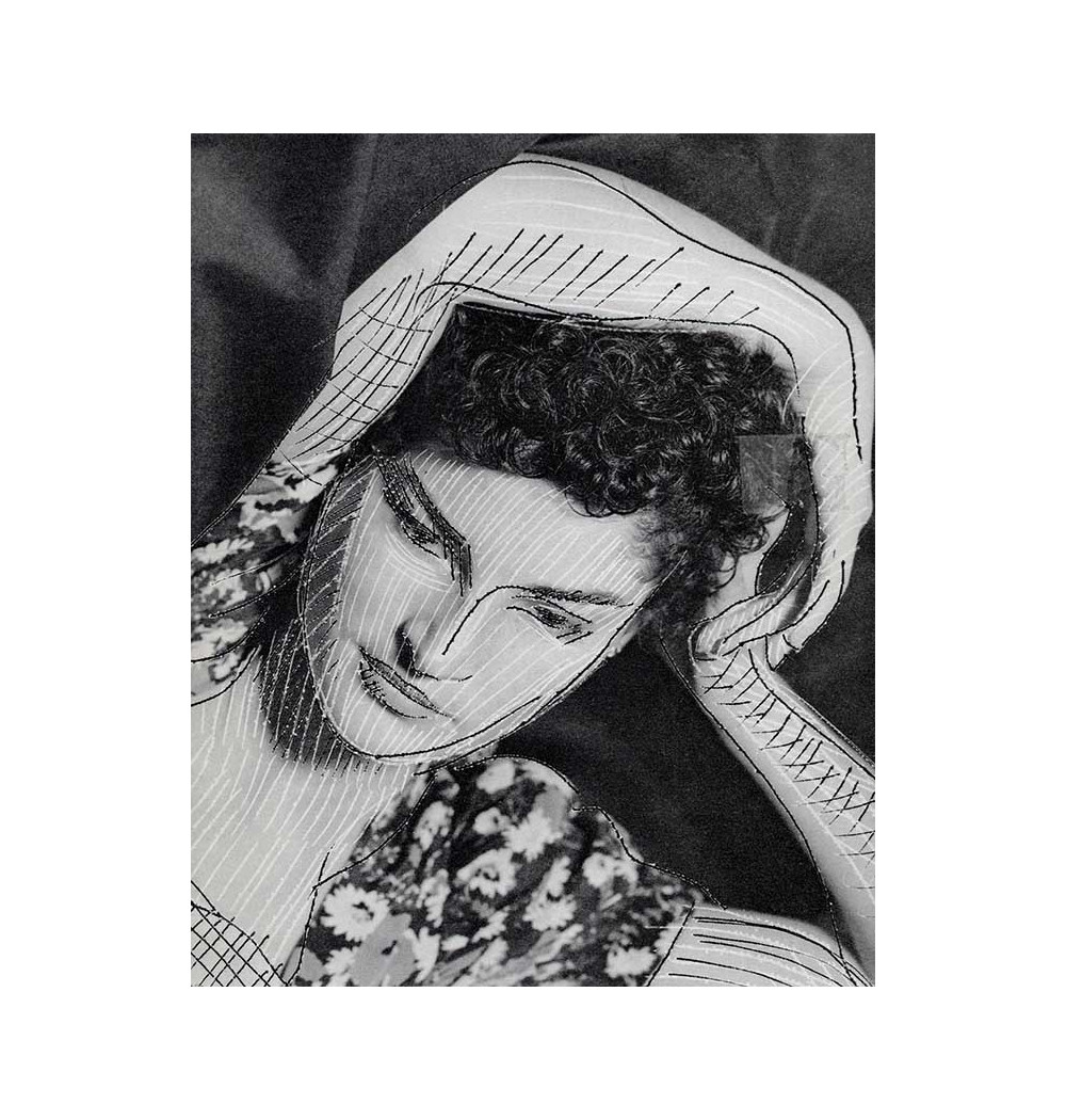 portrait of a woman with her head resting on one hand, the other arm curled above her head, floral blouse, redrawn with white and black lines