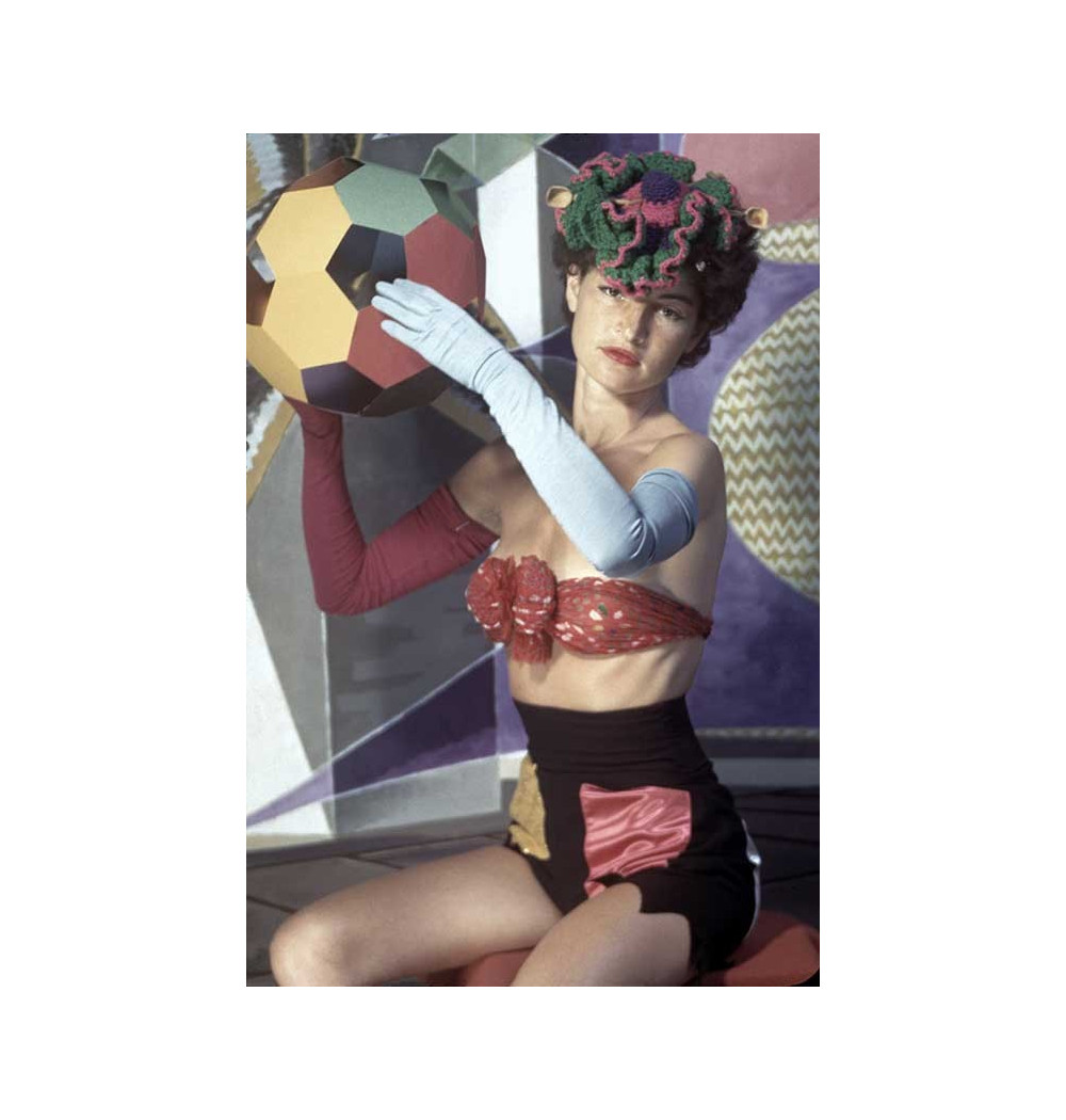 colour photograph, Juliet in swimming-suit hat and holding geometrical object non-euclidian red and blue gloves