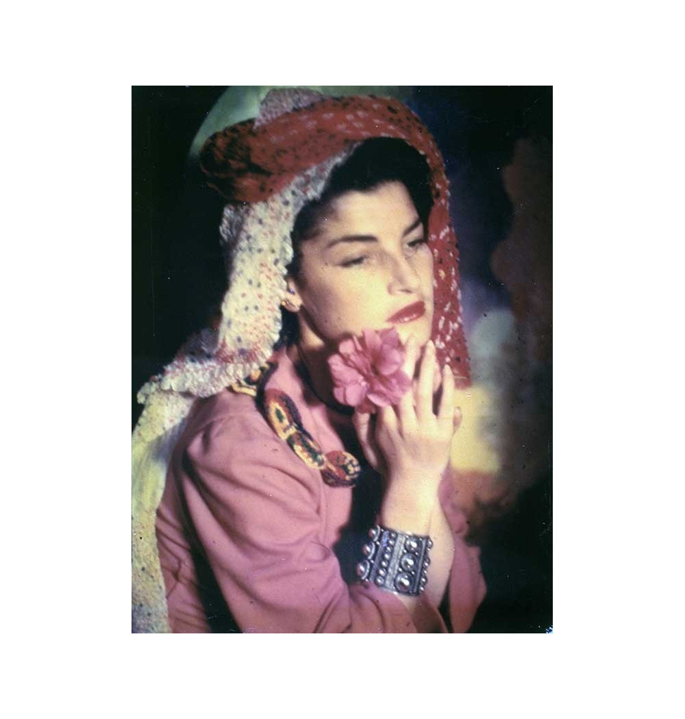 profile portrait woman covered with veil headscarf hands toghether flowers camellias red clothes colour photograph
