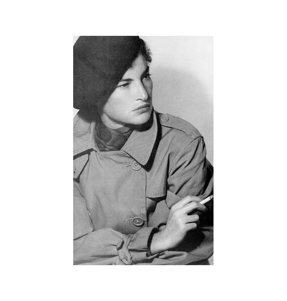 three-quaters portrait woman raincoat cigarette beret
