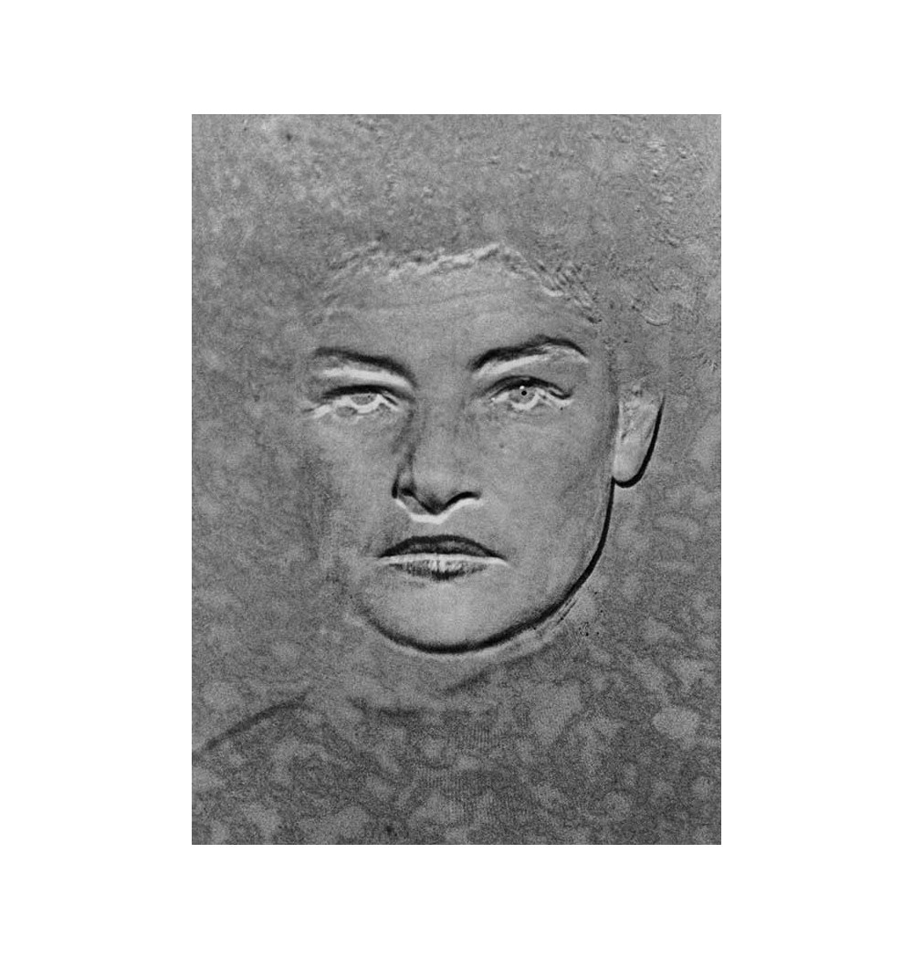 portrait woman solarization and superimposition outline of the face mouth eyes eyebrows and nose leaves in background