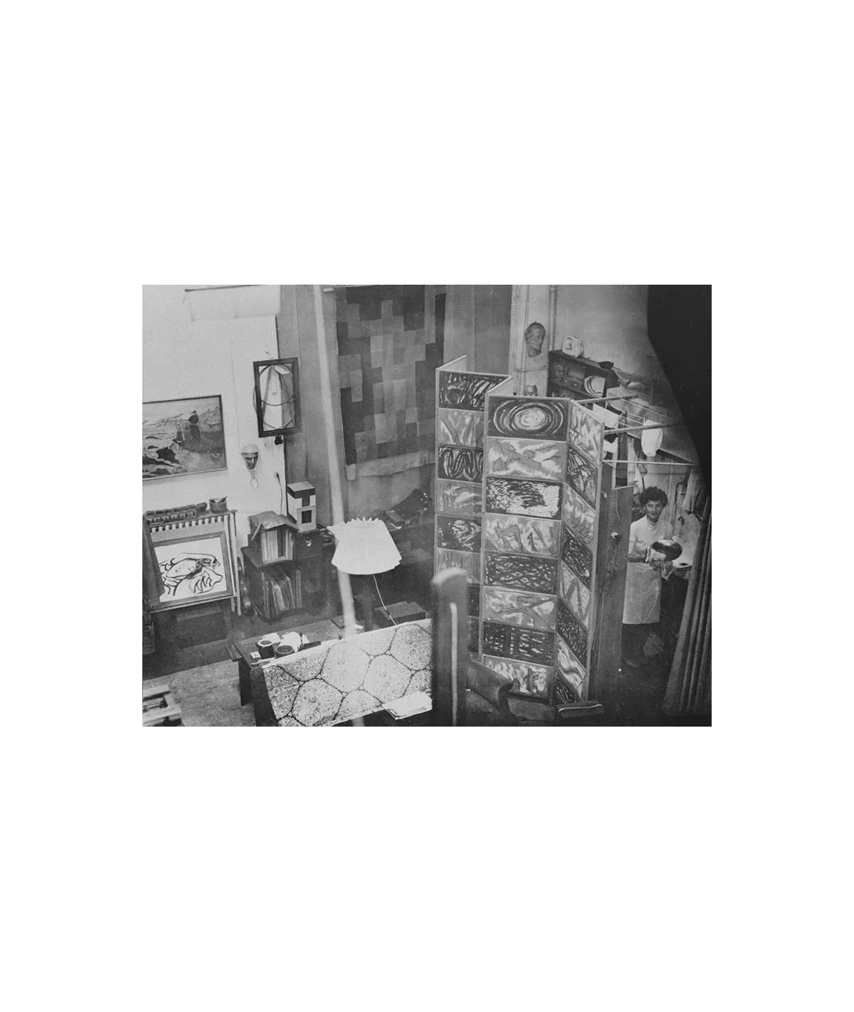 Juliet in workshop at Ferou street with paintings by Man Ray