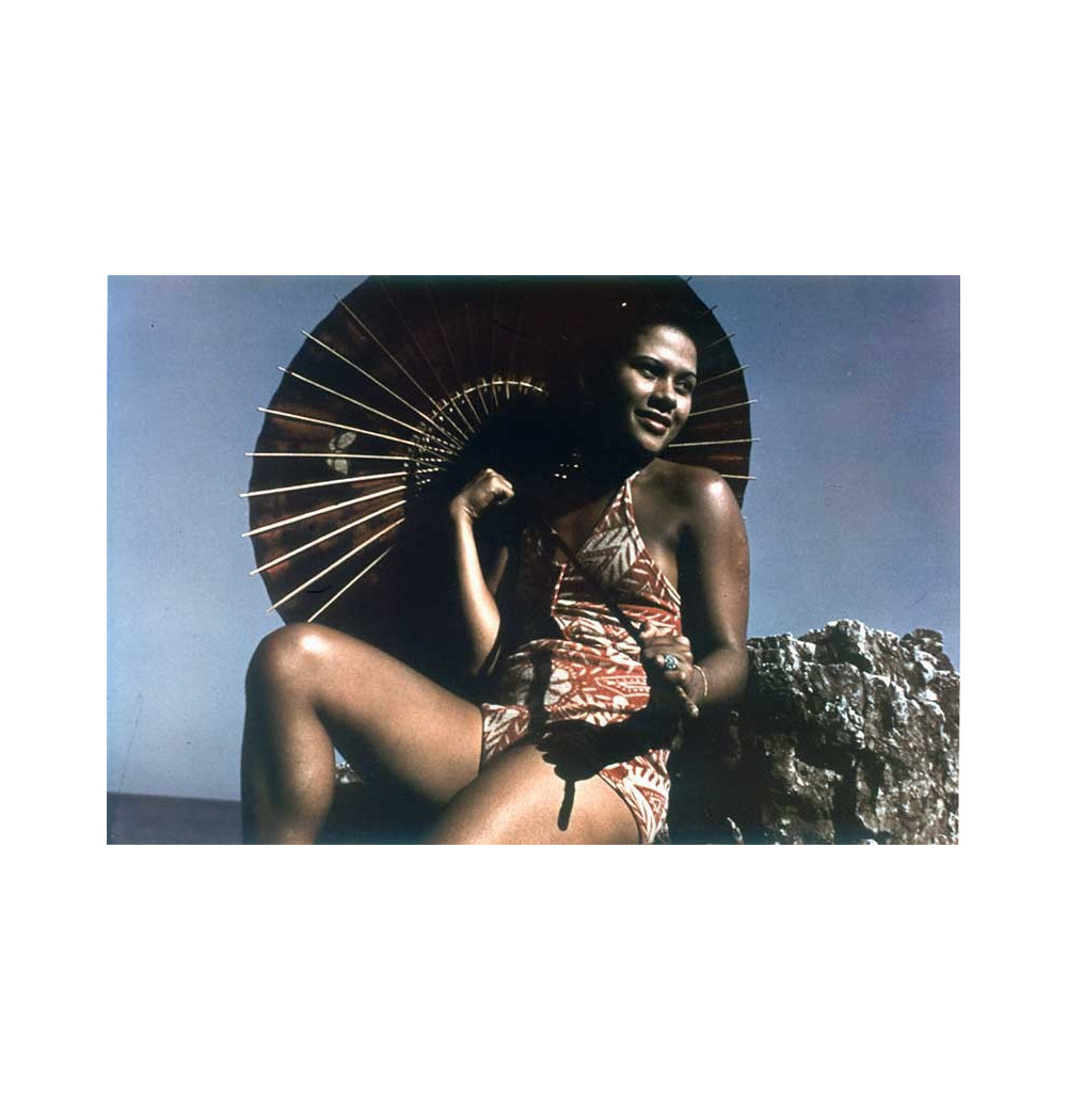 Adrienne Fidelin in a swimsuit, sitting in the rocks with an umbrella, Antibes