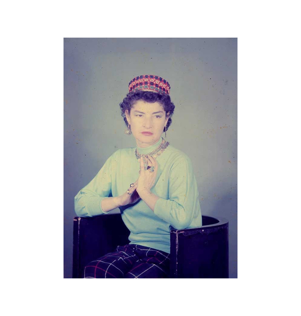 seated woman, clasped hands, rings, necklaces, earrings, headdress - color photograph