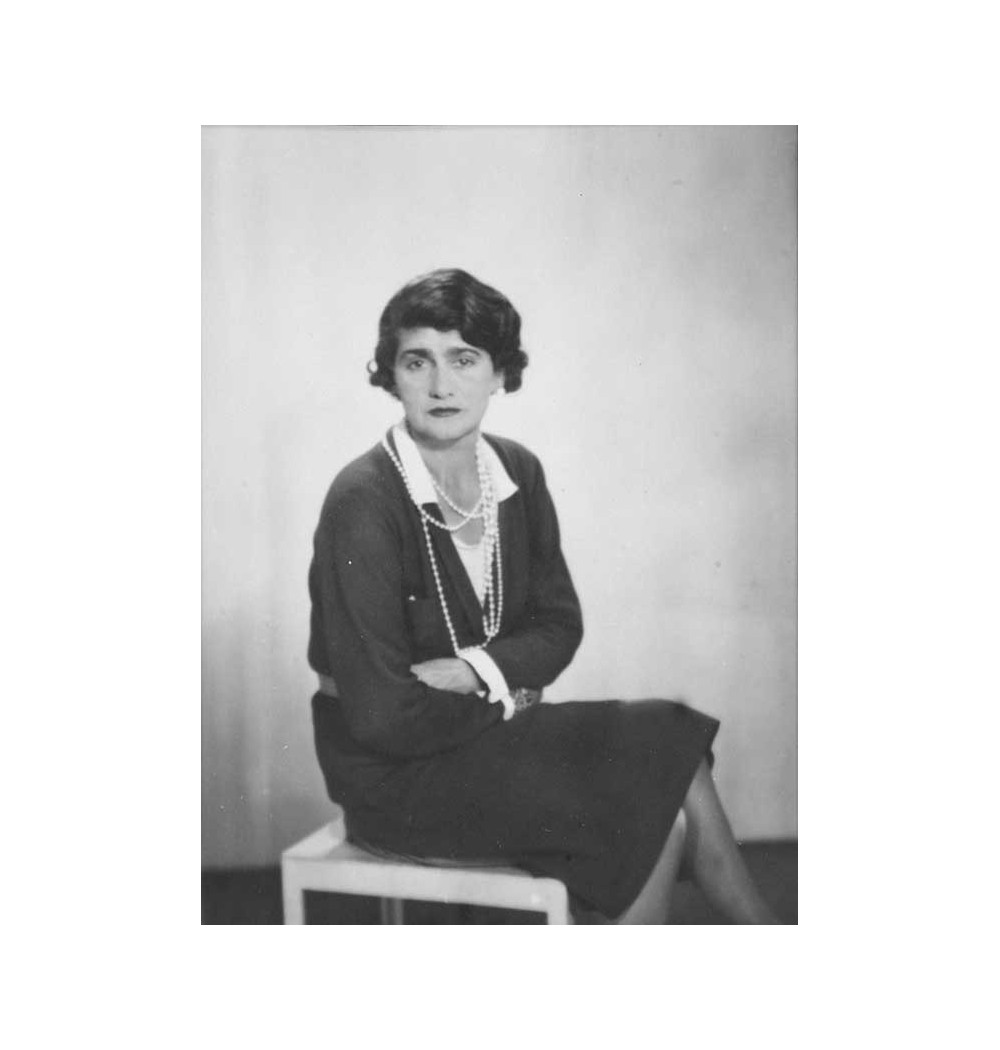 Coco Chanel woman in business suit and pearl necklace, sitting, arms crossed