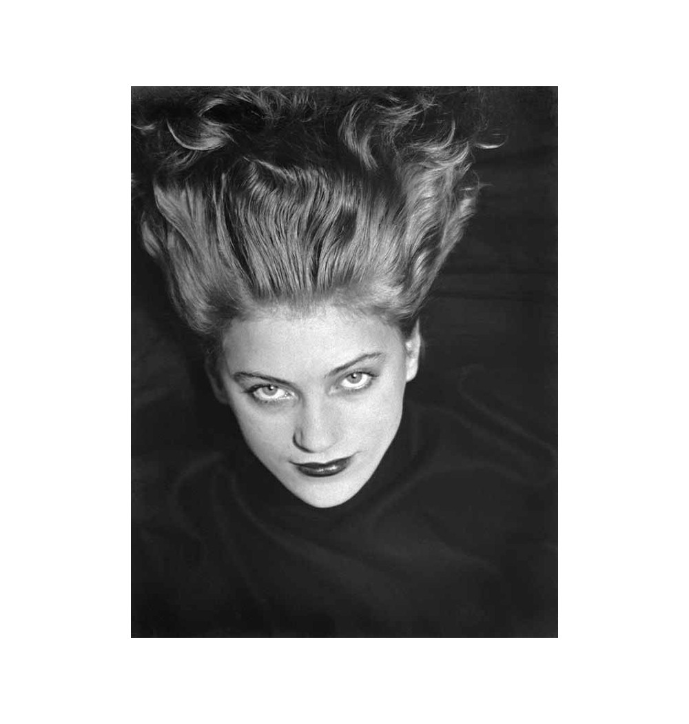 woman's face looking at us high angle shot blond hair body wraped up in black sheet