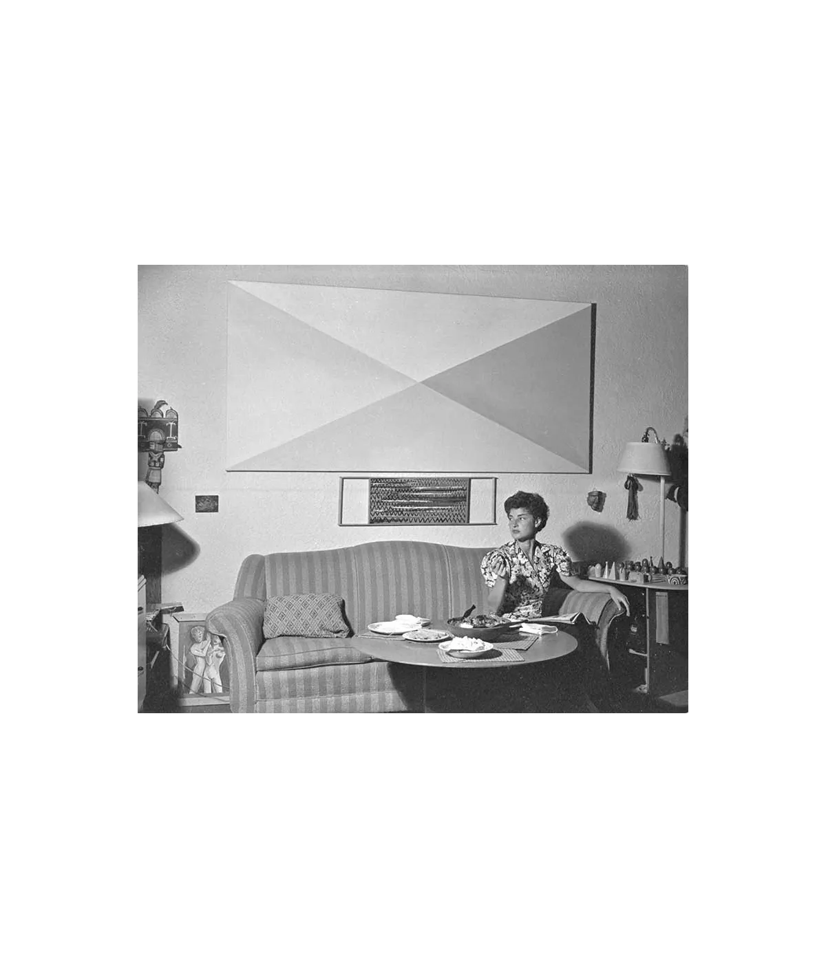woman sitting in armchair under painting in workshop studio Hollywood 1245 Vine Street