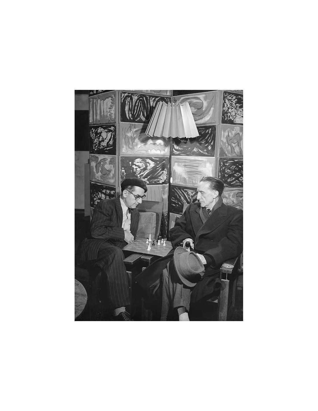Man Ray et Marcel Duchamp jouant aux échecs dans l'atelier de Man Ray, devant le paravent "les vingt jours et nuits de Juliet"