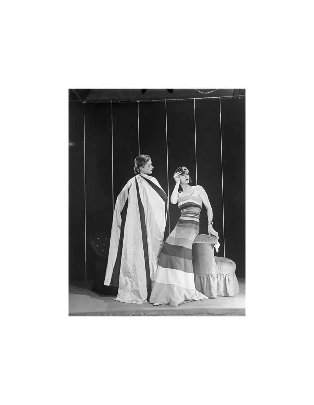 plan large de deux modèles l’une en robe rayée, l’autre debout dans une cape, Photographie de mode pour Harper's Bazaar