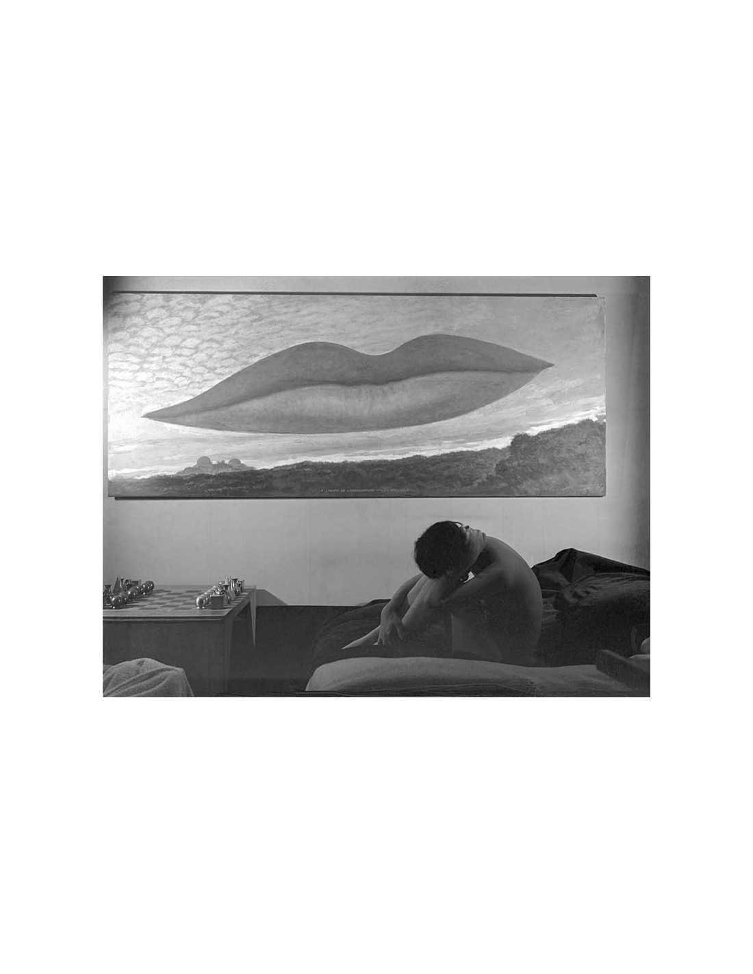 femme nue recroquevillée sur canapé sous le tableau de Man Ray "A l'Heure de l'Observatoire, les Amoureux", avec échiquier créé par Man Ray