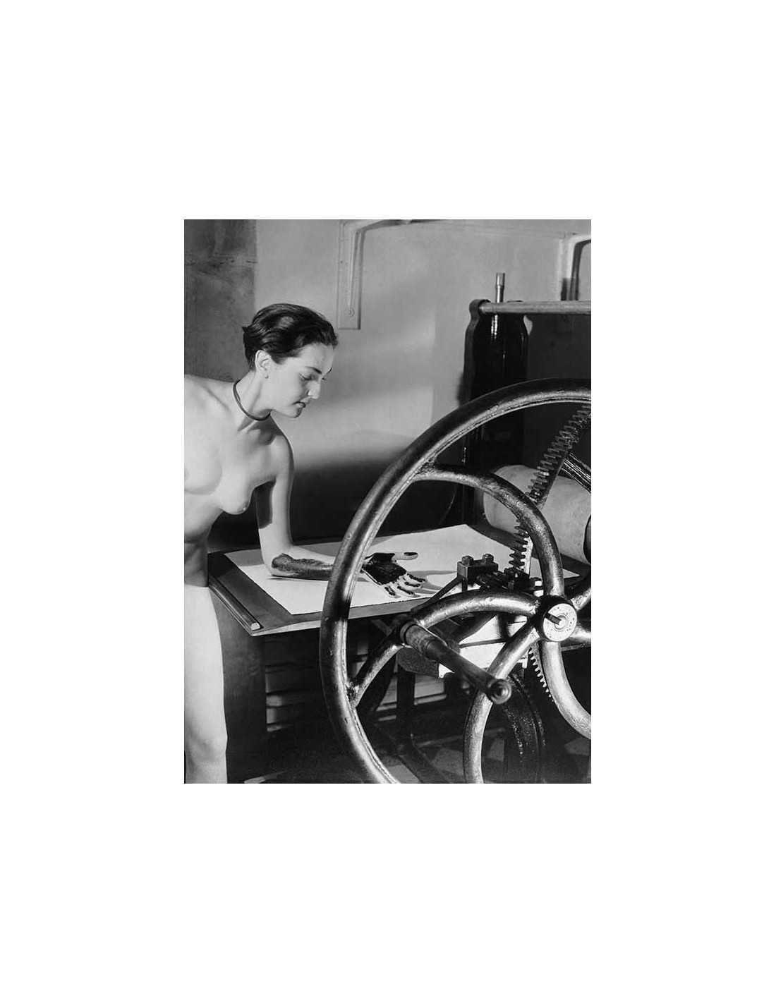 Nus Erotique voilée Photographie HD (300 DPI Tiff) 1933 - ref : 914/01 120,00 € Meret Oppenheim nue derrière une presse bras maculé d'encre Ajouter au panier