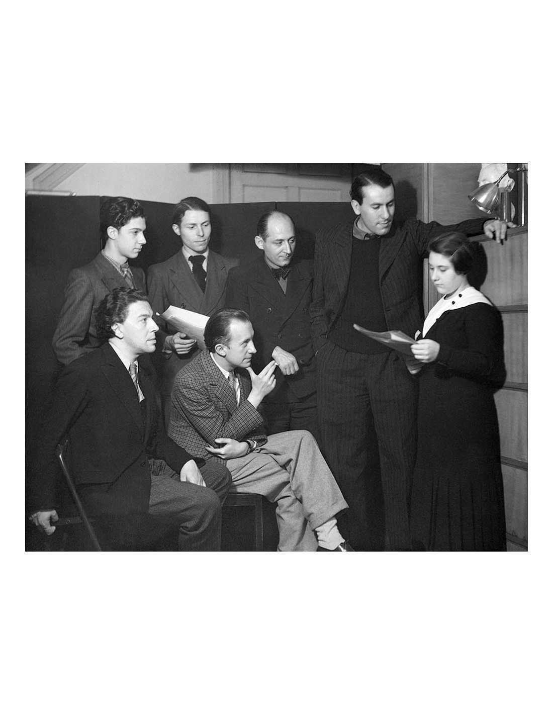 Gisèle Prassinos lisant ses poèmes - écriture automatique - à Jean-Marie Prassinos, Henri Parisot, Benjamin Péret, René Char - en bas : André Breton, Paul Eluard